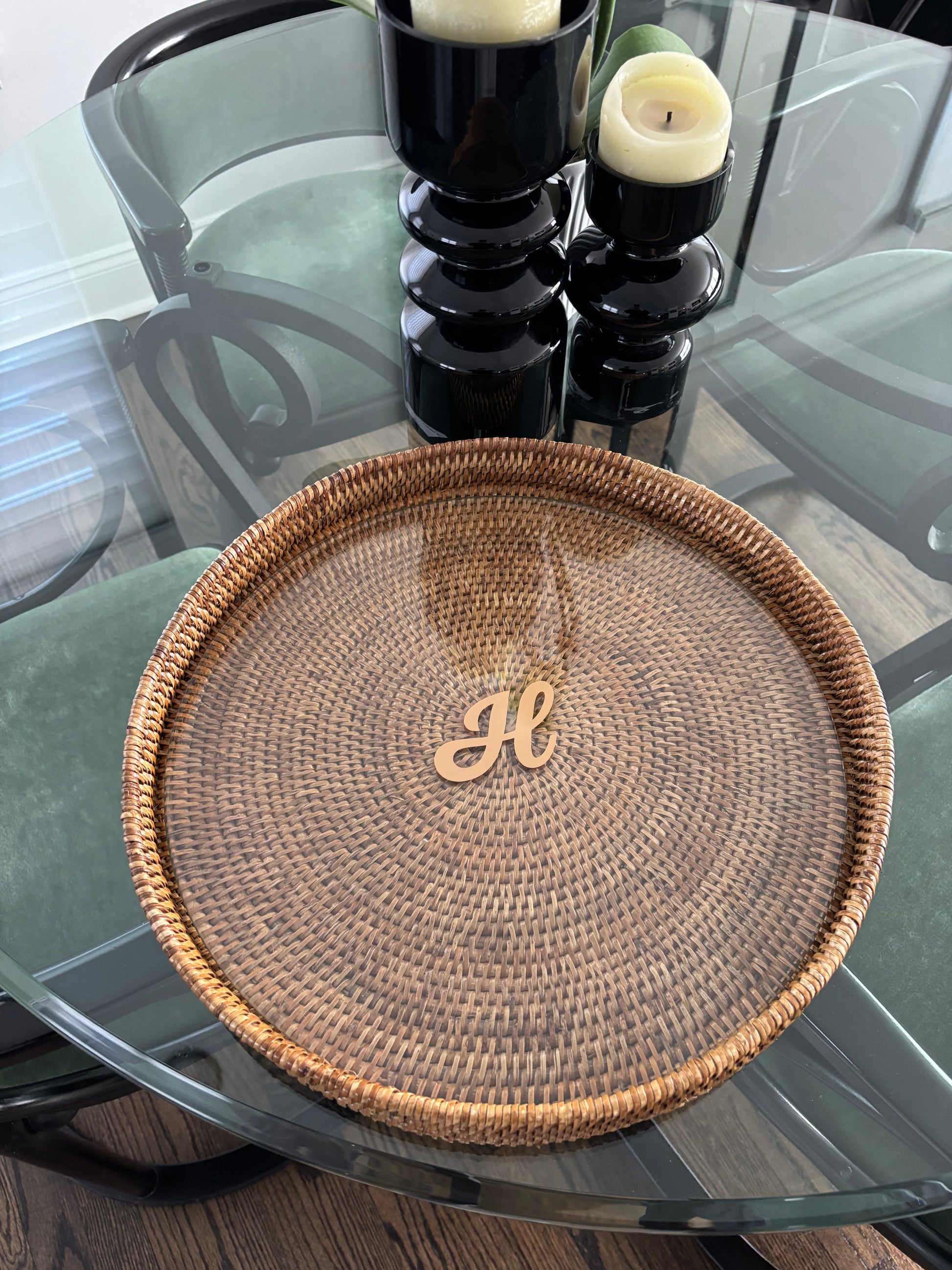 Elevate any occasion with our 16" x 2" round honey brown rattan tray with glass insert, adorned with your last name, monogram or any name on the glass insert.