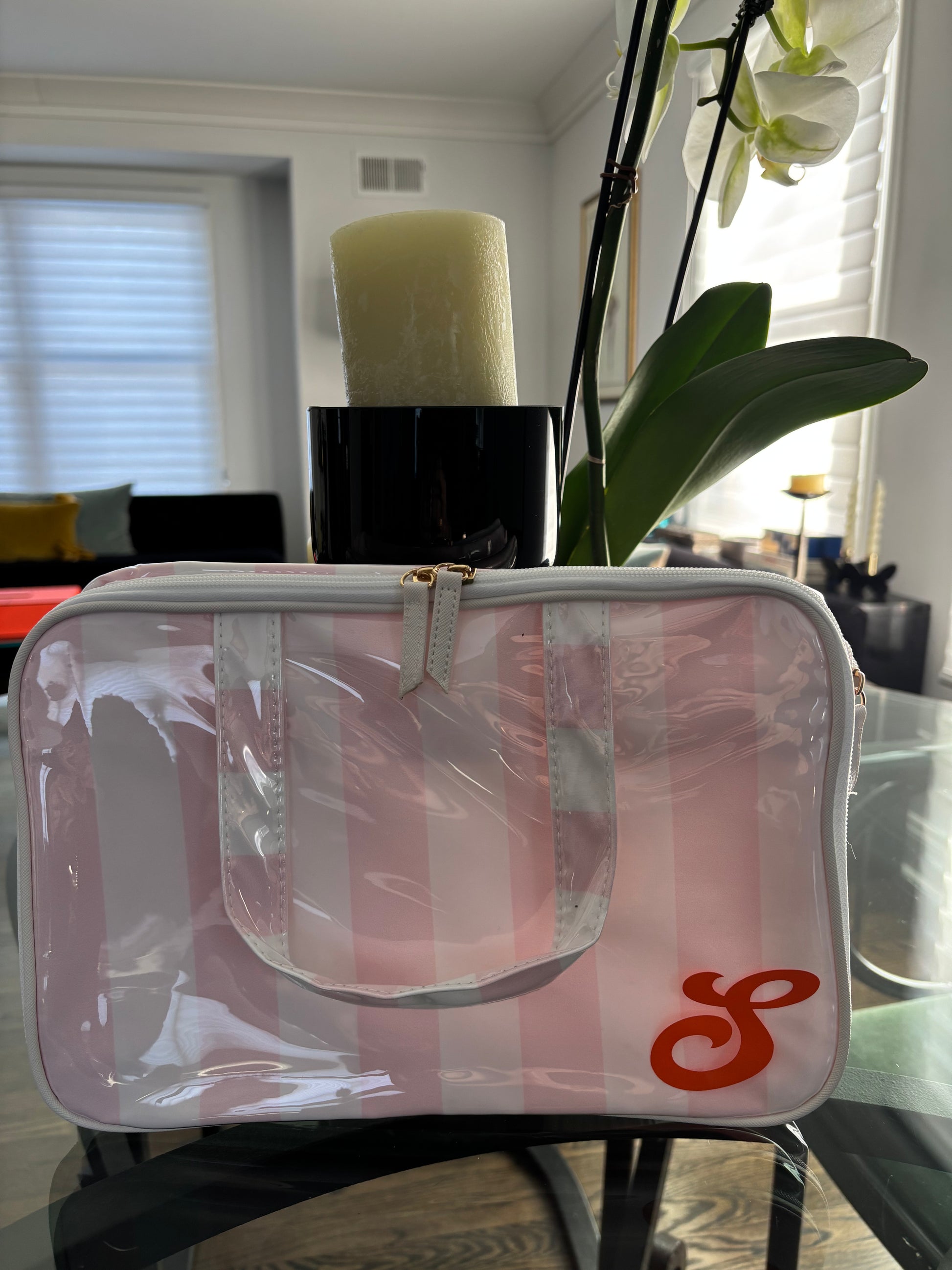 This personalized pale pink & white x large striped travel makeup bag is designed to keep all your cosmetics organized and stylish on the go. With a waterproof PVC-coated exterior, it's easy to wipe clean, making it ideal for busy travelers or daily use.
