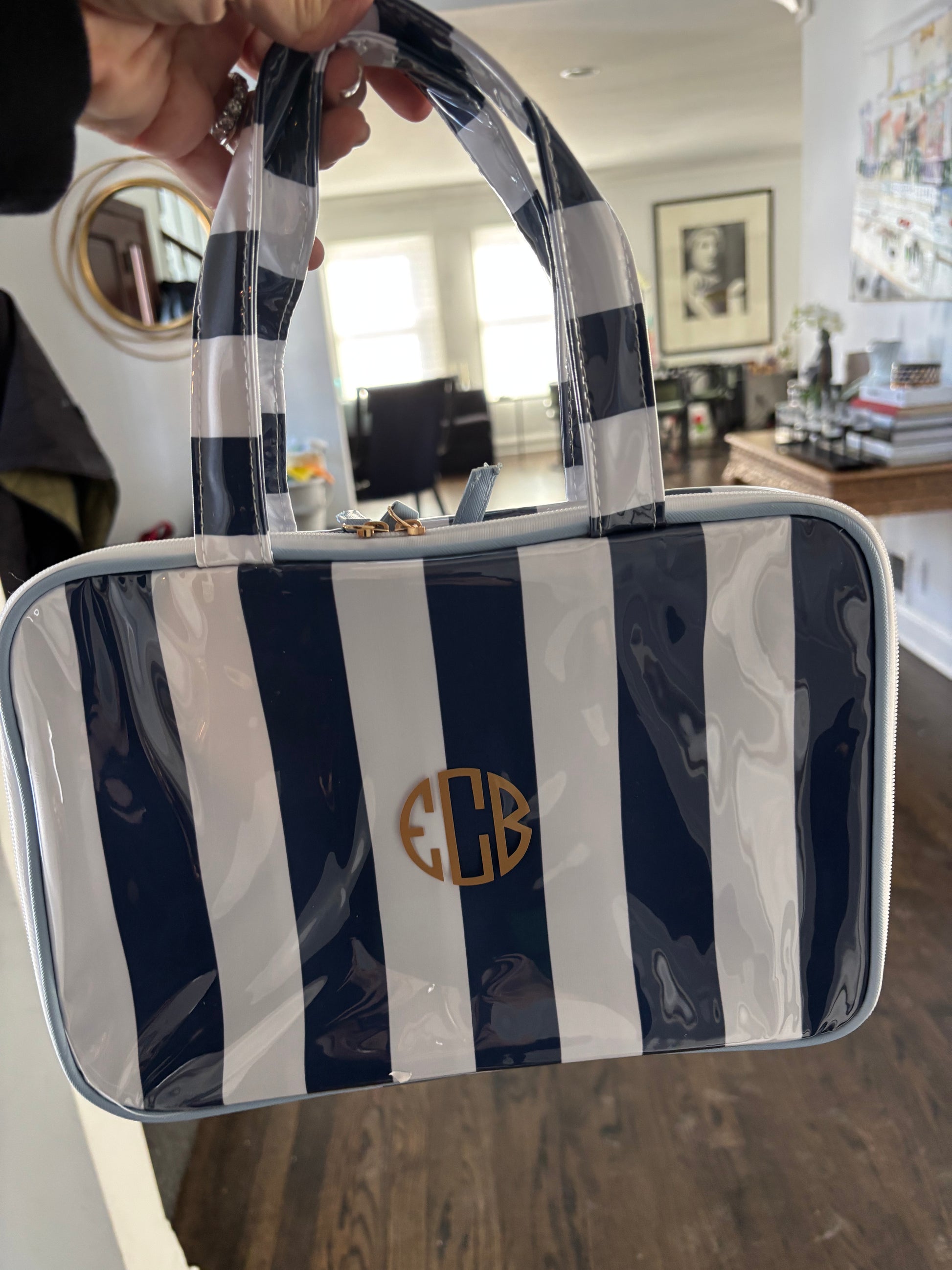 This personalized navy & white x large striped travel makeup bag is designed to keep all your cosmetics organized and stylish on the go. With a waterproof PVC-coated exterior, it's easy to wipe clean, making it ideal for busy travelers or daily use.