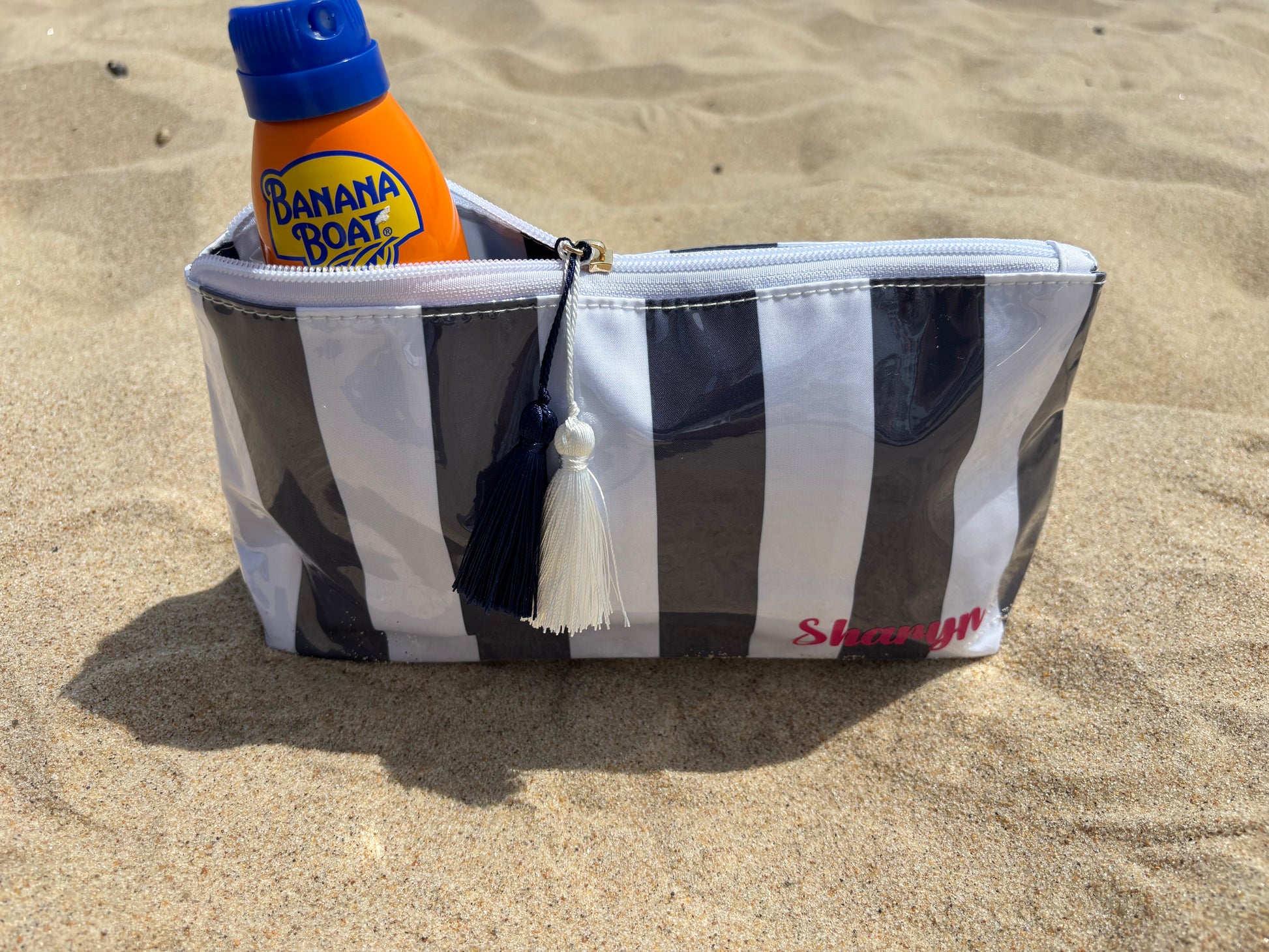 Discover our 10" x 3.5" x 5.5" personalized striped glossy pvc makeup bag. This bag is blue and white stripes. It has a blue and a white tassel on the zipper closure and it is waterproof.