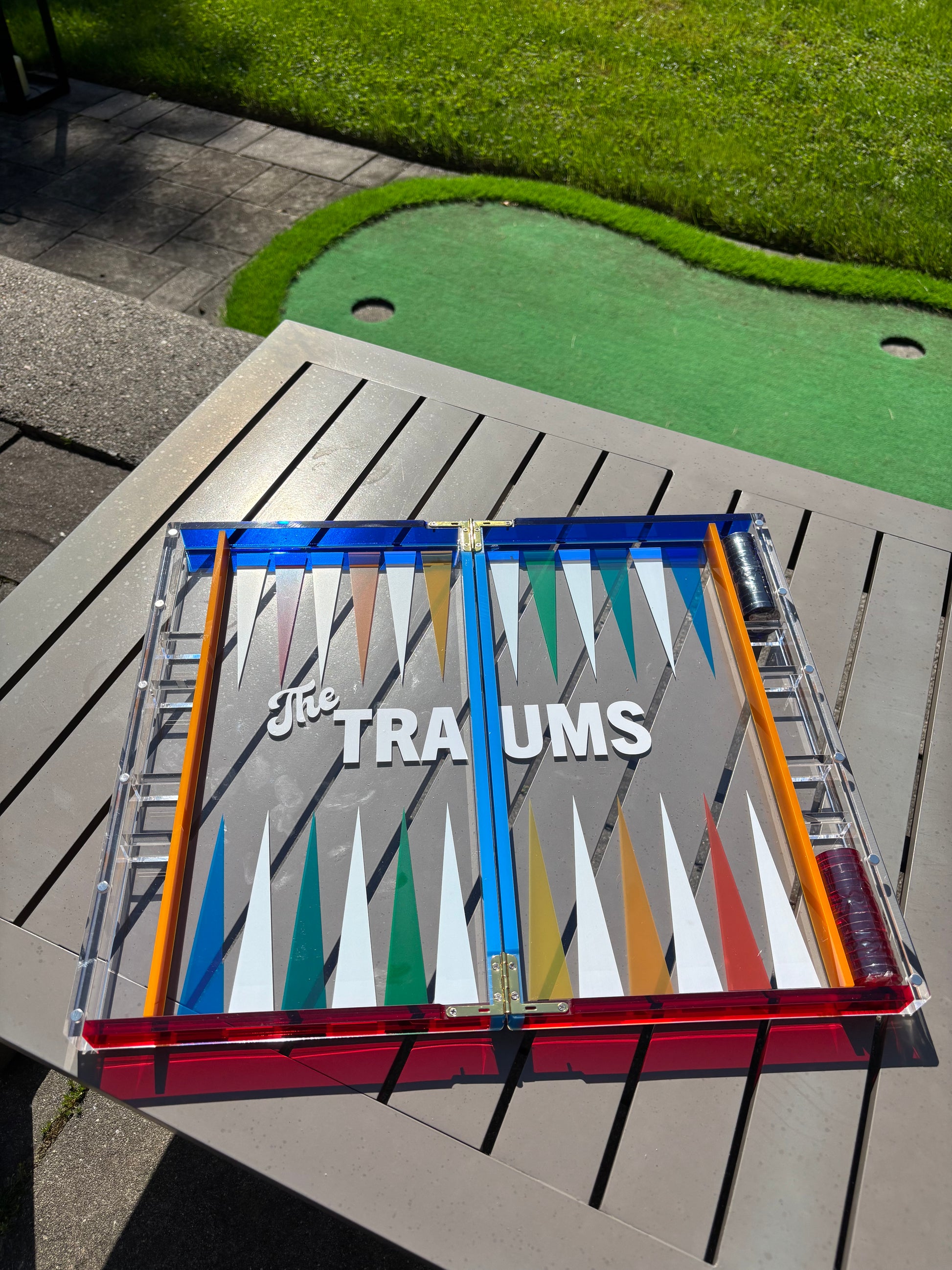 This is a 14" acrylic personalized backgammon set with magnetic closure. It can be personalized with your monogram, your name, your college or anything you would like.