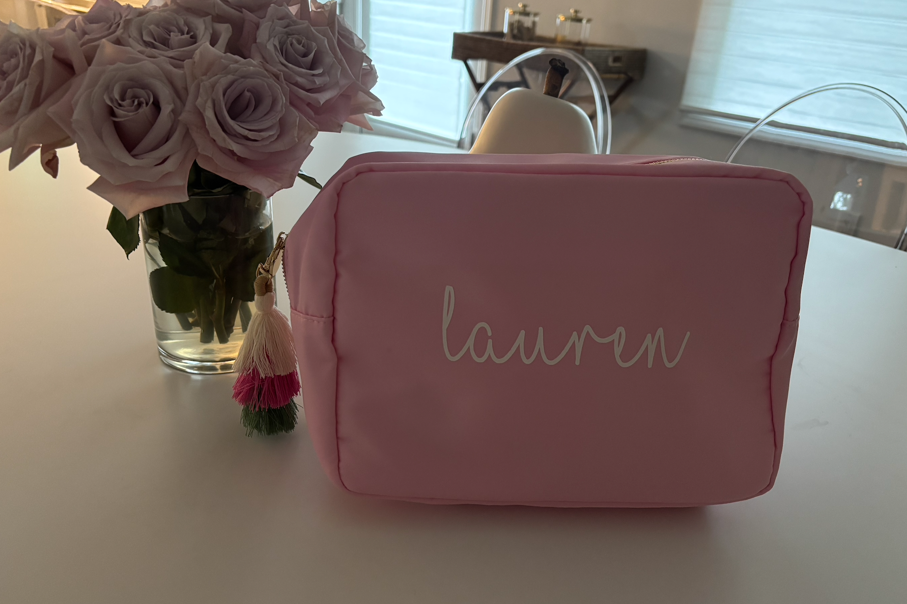 This is a pink nylon makeup bag, it is 11" wide , 7" high and 5" deep. The name is personalized in white permanent vinyl in the font i love glitter. This bag can be made with your name or your monogram in any colors .